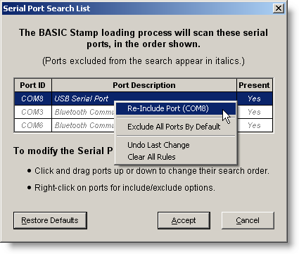 - Look for "Communications Port" or "USB Serial Port" in italics, with a "Yes" in the Present column. Ports that are present but have been excluded from the BASIC Stamp Editor's Serial Port Search List will appear in italics in the list. (Note that Bluetooth communications ports are excluded by default.)