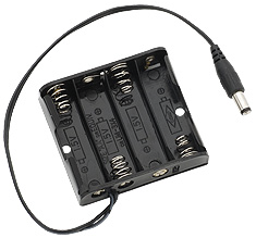 Like wall-mount supplies, battery holders must have a 2.1 mm center-positive plug. However, many battery holders don't have a symbol indicating whether or not the plug is center-positive. Use a voltmeter to test any battery holder of unknown origins. A 4 AA cell battery holder with a 2.1 mm center-positive plug is available from Parallax (#700-00038); this is the one included in the Boe-Bot Robot Kit.