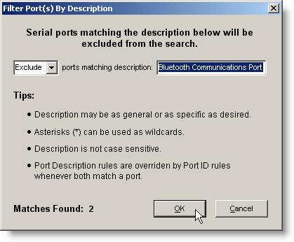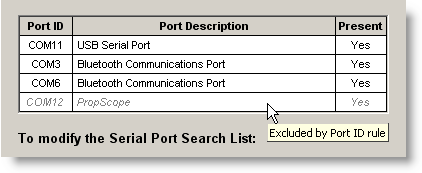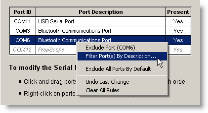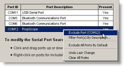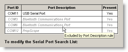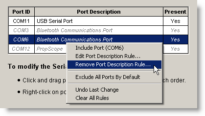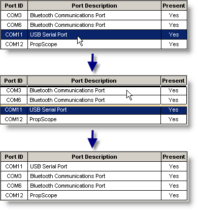 The port list automatically updates whenever ports appear and disappear; such as USB-to-Serial ports. This is an interactive control; use your mouse to view and modify the list as indicated below.