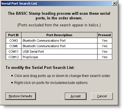 This dialog indicates what serial ports will be scanned, and the order they will be accessed, whenever a BASIC Stamp identification or download process is started. Use this feature to fine-tune the BASIC Stamp search to include or exclude certain serial ports.