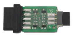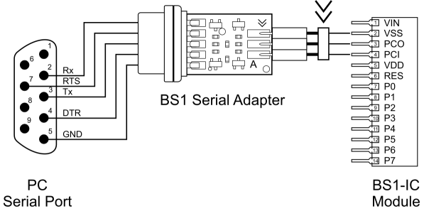 Starting with Version 2.1, the BASIC Stamp Editor/Compiler supports programming BASIC Stamp 1 modules through a standard serial connection using the adapter shown above and below. The adapter translates the voltage and mechanical differences of the BS1 to be compatible with the serial port. For convenience, Parallax manufactures the BASIC Stamp 1 Serial Adapter (#27111) that plugs into the end of a serial cable and connects to the programming header of the BS1.