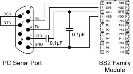 We recommend using a Parallax development board and cable for programming BASIC Stamp modules. When these items are not available, you may create your own board by duplicating the following diagrams with your own circuits and cables.