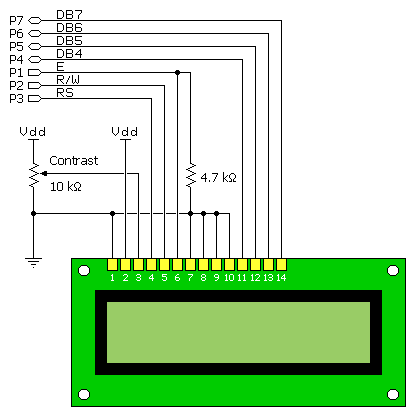 | I/O pin arrangement when Pin is 8 or 9 | 8 or 9 (depending on Pin) : LCD Enable (E) pin 10 : LCD Read/Write (R/W) pin 11 : LCD Register Select (RS) pin 12 - 15 : LCD Data Bus (DB4 - DB7, respectively) pins |