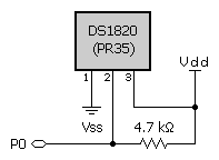This program uses a Dallas Semiconductor DS1820 Digital Thermometer device connected as follows. Note that the 4.7 kΩ pull-up resistor is required for proper operation.
