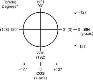 degrees (128 brads), Cosine is -127. At 270 degrees (192 brads), Cosine is 0 again.