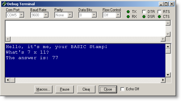 A Download Progress window will appear briefly as the program is transmitted from your computer to your BASIC Stamp module. The figure below shows the Debug Terminal that should appear when the download is complete. You can prove to yourself that this is a message from the BASIC Stamp by pressing and releasing the Reset button on your board. Every time you press and release it, the program will re-run, and you will see another copy of the message displayed in the Debug Terminal.