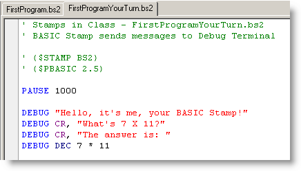Tip: The next time you save, the BASIC Stamp Editor will automatically save to the same filename (FirstProgram.bs2) unless you tell it to save to a different filename by clicking File and selecting Save As (instead of just Save).