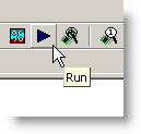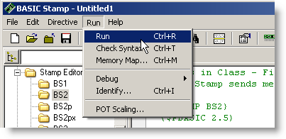 The BASIC Stamp Editor has shortcuts for most common tasks. For example, to run a program, you can press the ‘Ctrl’ and ‘R’ keys at the same time. You can also click the Run button. It’s the blue triangle that looks like a music player’s Play button. The flyover help (the Run hint) will appear if you point at the Run button with your mouse. You can get similar hints to find out what the other buttons do by pointing at them too.