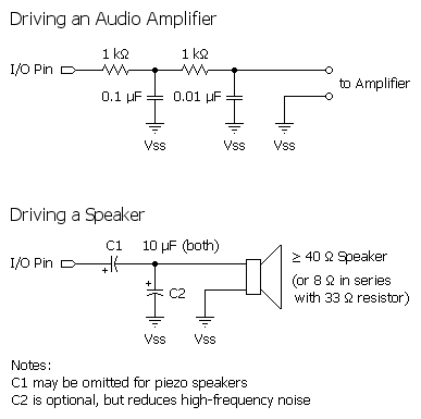 FREQOUT generates one or two sine waves using a pulse-width modulation algorithm. The circuits in the figure below work by filtering out the high-frequency PWM used to generate the sine waves. FREQOUT works over a very wide range of frequencies so at the upper end of its range, those PWM filters will also filter out most of the desired frequency. You may find it necessary to reduce values of the parallel capacitors shown in the circuit, or to devise a custom active filter for your application.