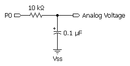 In order to convert PWM into an analog voltage we have to filter out the pulses and store the average voltage. The resistor/capacitor combination shown below will do the job. The capacitor will hold the voltage set by PWM even after the instruction has finished. How long it will hold the voltage depends on how much current is drawn from it by external circuitry, and the internal leakage of the capacitor. In order to hold the voltage relatively steady, a program must periodically repeat the PWM instruction to give the capacitor a fresh charge.