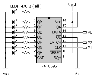 ' SHIFTOUT.BS2 ' This program uses the SHIFTOUT command to interface to the 74HC595 shift ' register as an 8-bit output port. The '595 requires a minimum of three ' inputs: data, clock, and latch. See the figure in the SHIFTOUT command ' description in the manual for wiring information. SHIFTOUT automatically ' handles the data and clock, pulsing the clock to shift data bits into the ' '595. An extra step (pulsing the latch input) is required to move the ' shifted bits in parallel onto the '595's output pins. Note: this code does ' not control the output-enable or reset lines of the '595. This means that ' before the BASIC Stamp first sends, the '595's output latches are turned ' on and may contain random data. In critical applications, you should hold ' output-enable high (disabled) until the BASIC Stamp can take control. ' {$STAMP BS2} ' {$PBASIC 2.5} Dpin PIN 0 ' data pin to 74HC595 Clk PIN 1 ' shift clock to 74HC595 Latch PIN 2 ' latch 74HC595 outputs counter VAR Byte Setup: LOW Latch ' initialize latch output ' This loop moves the 8-bit value 'counter' onto the output lines of the ' '595, pauses, then increments counter and repeats. The data is shifted ' MSB first so that the MSB appears on pin QH and the lsb on QA. Changing ' MSBFIRST to LSBFIRST causes the data to appear backwards on the outputs. Main: DO SHIFTOUT Dpin, Clk, MSBFIRST, [counter] ' send the bits PULSOUT Latch, 1 ' transfer to outputs PAUSE 100 ' Wait 0.1 seconds counter = counter + 1 ' increment counter LOOP END