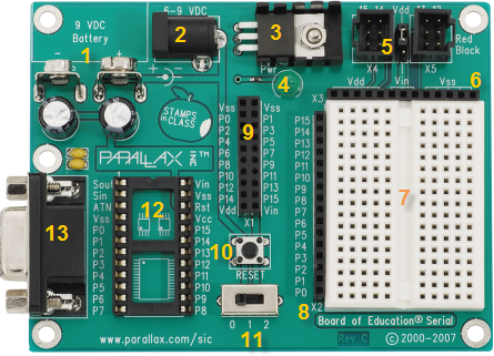 : The leftmost position (0) is OFF – all power is disconnected. Always place the switch in this position when adding or changing components on the breadboard. The middle position (1) provides Vin (unregulated battery or power supply voltage) to the regulator, the BASIC Stamp socket, and to the connectors marked “Vin.” This switch position also makes Vdd (5 volts) available to Vdd sockets on the breadboard and AppMod connectors. The rightmost position (2) also provides power to the servo connectors X4 and X5. Especially if your program causes a robot with servos connected to X4/X5 to start moving immediately, you can keep the 3-position switch in position (1) while loading the program, then switch to position (2) when you are ready for the robot to start moving.
