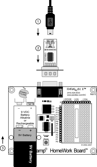 Tip: If you have a BASIC Stamp program running and want to take your board away from your computer, always disconnect and reconnect at the DB9 socket. Leave the USB to Serial Adapter connected to your computer. This will leave the virtual COM port open, allowing you to reconnect your board without the USB port resetting your BASIC Stamp. See the article USB Resets BASIC Stamp for more information.